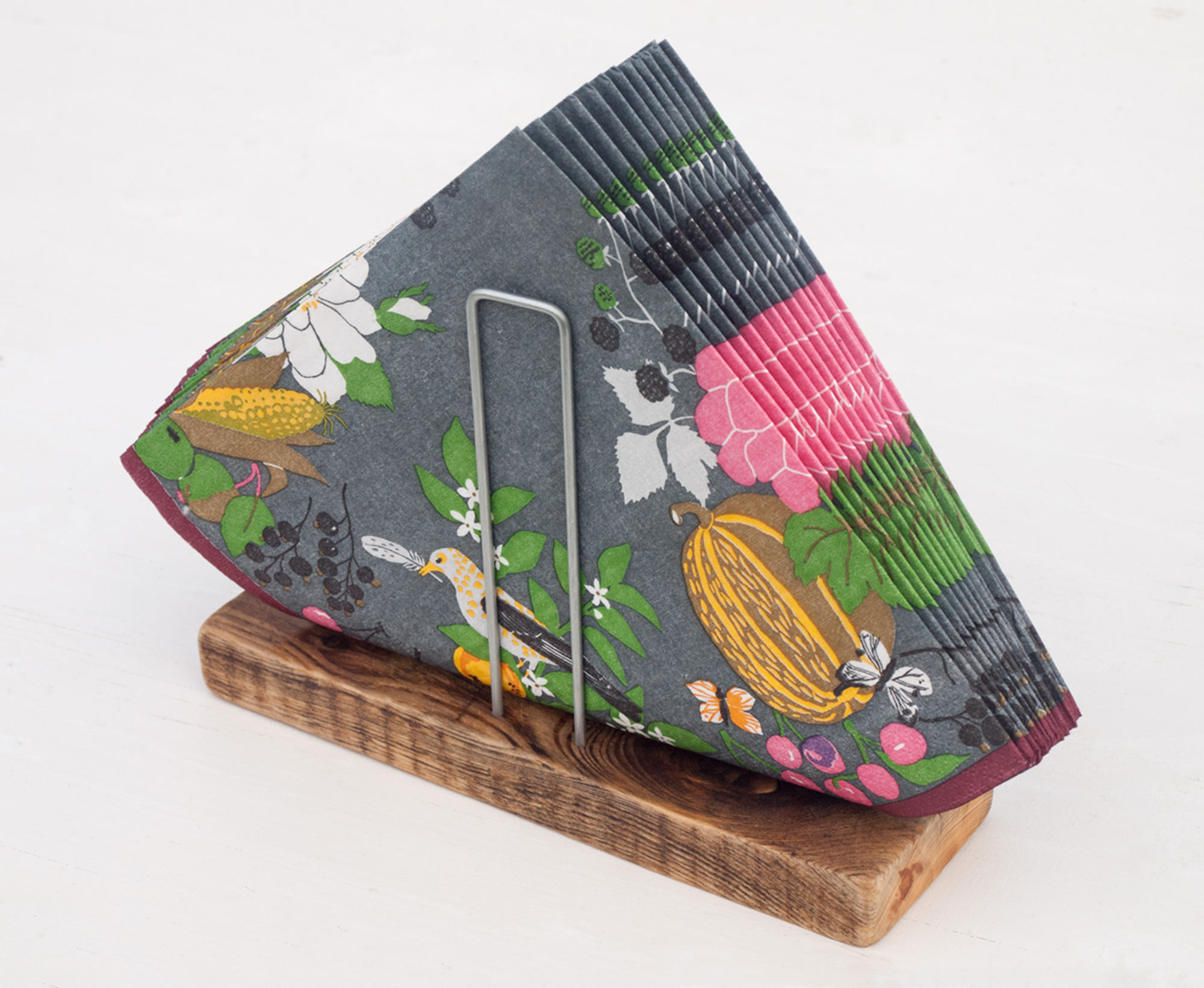These rustic napkin holder table stands are made from naturally weathered and aged, reclaimed timber boards and bent steel metal rod.